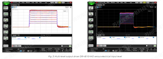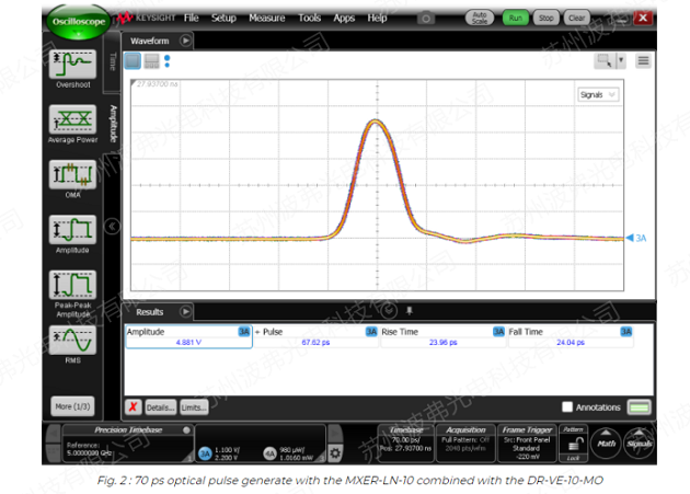 使用AWG,第一调制块AM1用于产生超短光脉冲。采用iXblueNIR-MX800、MXER1300和MXER高对比度宽带幅度调制器,分别在850nm、1310nm和1550nm处获得70ps的超短光脉冲。调制器与驱动器DR-VE-10-MO相结合,DR-VE-10-MO可被设置为方形或高斯脉冲,限幅或线性放大器。采用iXblue偏压控制器MBC-DG-LAB,在高达数GHz的脉冲重频下,获得了较高的脉冲消光比稳定性。