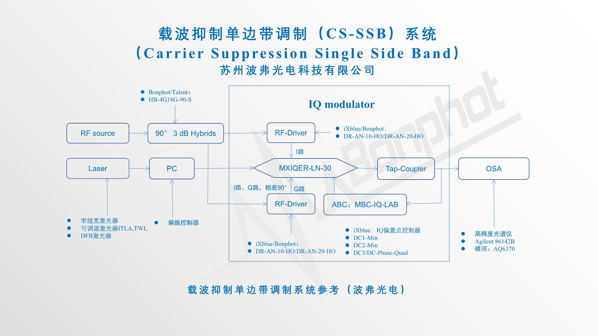 目前苏州jinnianhui今年会科技有限公司提供的基于法国iXblue公司的高消光比IQ调制器(MXIQER)、配合我们提供的驱动(DR-AN-10-HO/DR-AN-20-HO)以及偏置控制器(MBC-IQ-LAB-A1),可以实现>30dB(1000:1)载波抑制比,具有无可比拟的性能及优势。