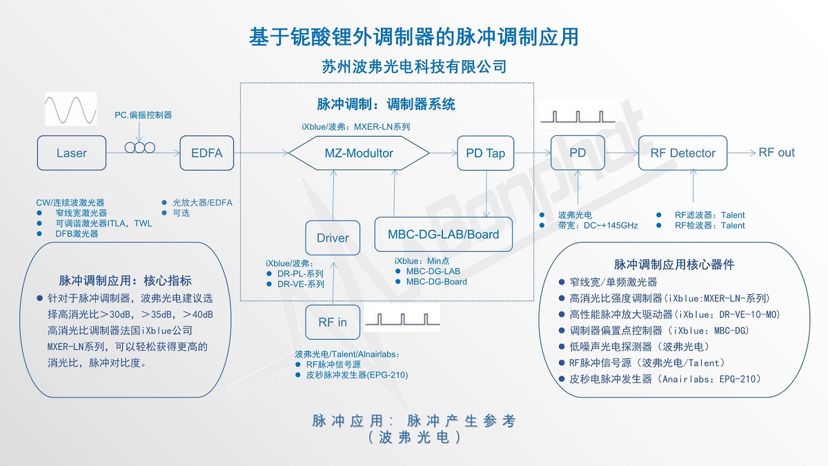 苏州jinnianhui今年会科技有限公司提供基于法国iXblue公司铌酸锂马赫增德尔高消光比强度调制器的脉冲调制元件的脉冲调制方案,这些方案包括常用的脉冲产生(脉冲调制)、脉冲整形、脉冲拾取等。基于法国iXblue高消光比强度调制器MXER-LN系列,可以轻松获得足够的消光比和脉冲对比度。更多详细情况请联系苏州jinnianhui今年会科技有限公司相关销售人员获取。
