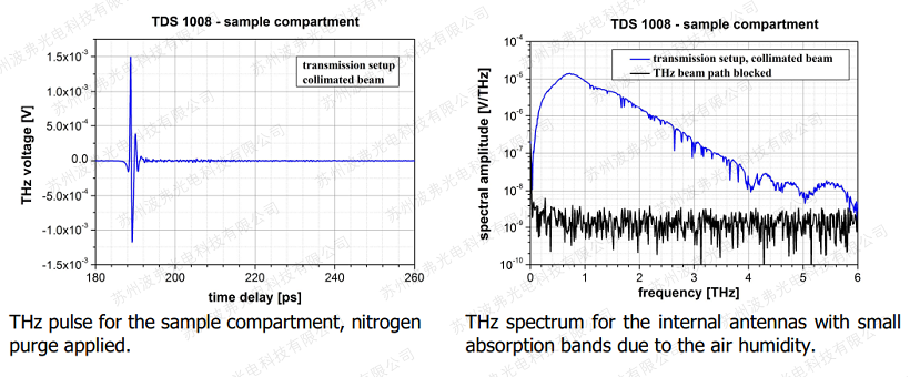 太赫兹时域光谱仪 TDS1008 带氮气吹扫样品室,用于透射和反射测量。 可以连接额外的光纤耦合太赫兹天线以进行外部测量设置。