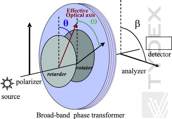 图1.以琼斯形式表示的宽带相位变换器及其相对于偏振器和分析仪的位置