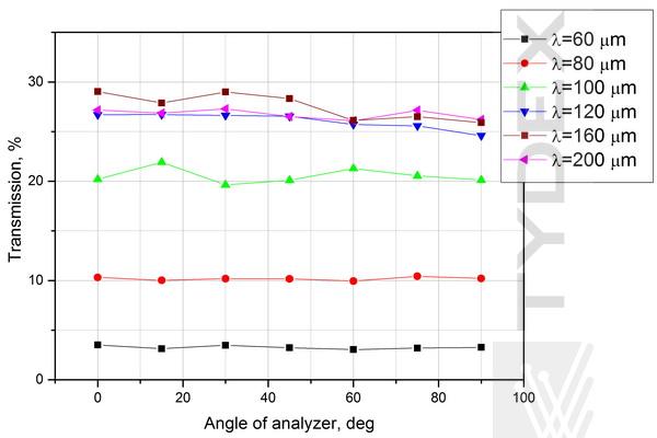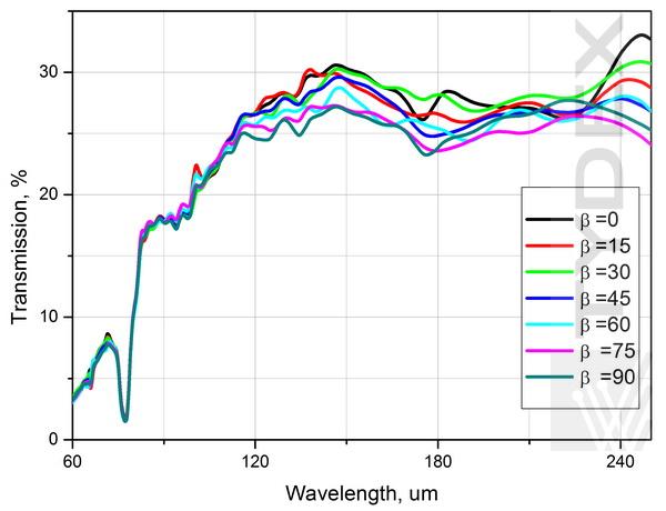 图5. APC L/4@60-300 um的测量透射率作为分析仪角度β的函数
