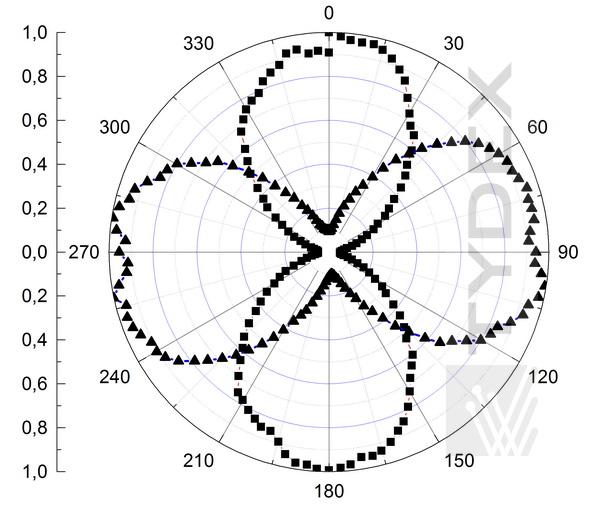 图6. b)在圆偏振辐射通过AWPL/4@60-95um的情况下,激光辐射强度与分析仪旋转角度的关系