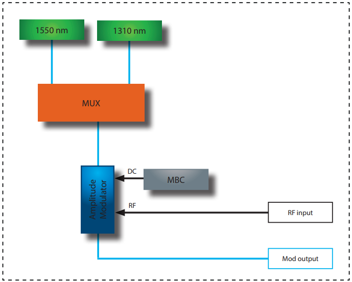 • 调制器偏置控制器:内部LiNbo3调制器是具有非常低漂移的X-切设计器件。然而,无论环境条件如何,都提供了一个自动偏置控制电路来将调制器的工作点锁定在正交点。MBC确保了随时间的稳定操作,并显示出非常低的噪声灵敏度,从而显著降低了所需的抖动电压幅度。